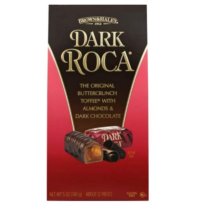 Dark ROCA Buttercrunch adds rich cocoa butter and Dark Chocolate from carefully selected cocoa beans to ROCA center. Each bite blends buttery toffee crunch with rich, luxurious chocolate. Buttercrunch toffee center with almonds, covered in a rich blend of cocoa butter and milk chocolate.