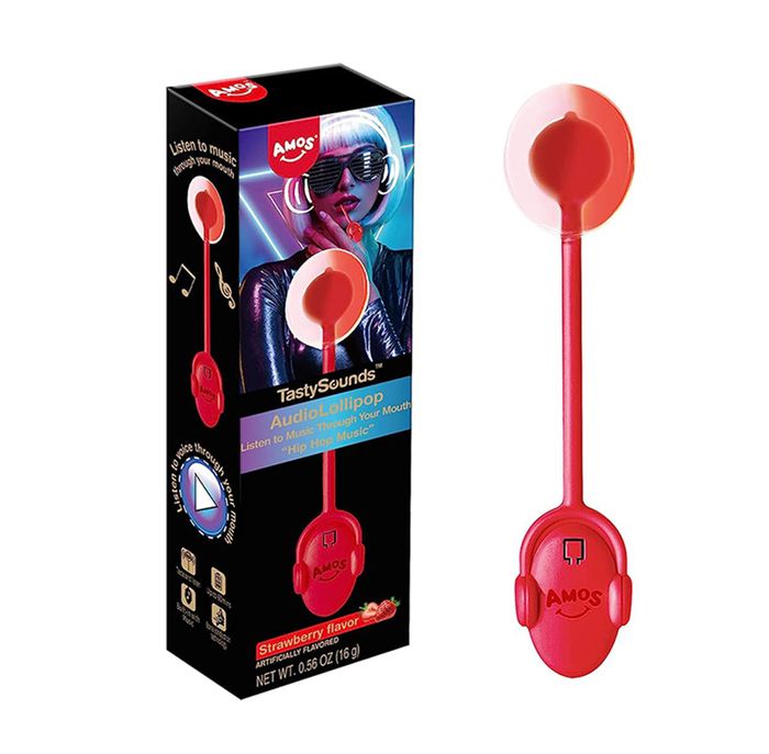 Listen to music through your mouth! These lollipops will blow your mind. 3 Hiphop tracks to suck on in delicious strawberry.