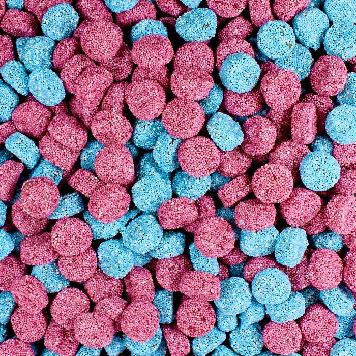 Aniseed favour jubes with pink or blue sprinkle coating.