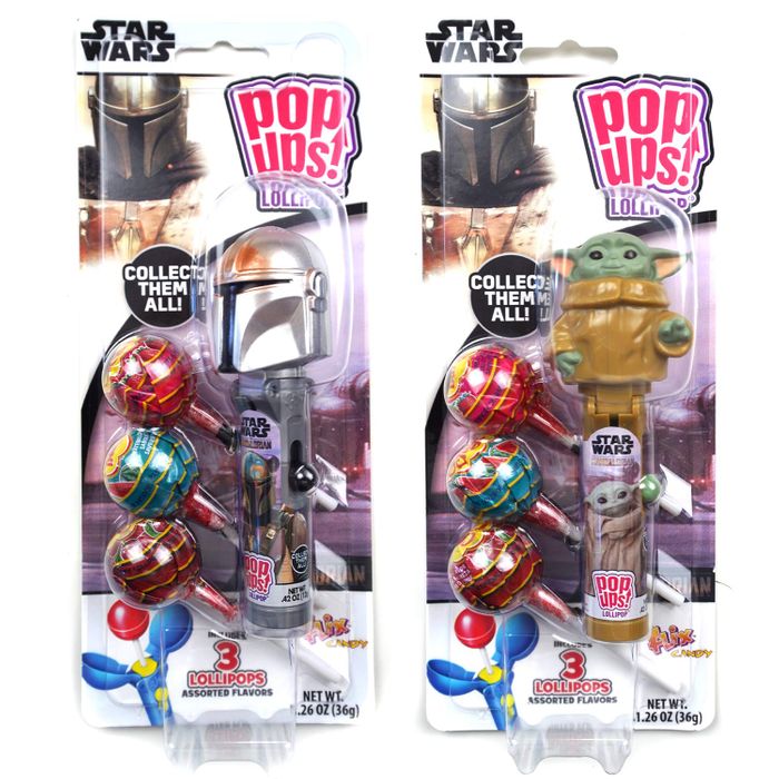 Everyones favorite wrinkly green baby, Grogu, and his adoptive dad, the Mandalorian, are now available as Pop-Ups! Each one contains one Pop Up and three Chupa Chups lollipops. Pop your lollipop into the Pop Up, push and lick, and then store away for later!