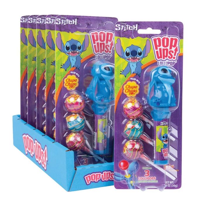 Ohana means family and family means no one gets left behind or forgotten. Pick up this cute Stitch themed Pop Up today for you or a member of your ohana! Each one contains one Pop Up and three Chupa Chups lollipops. Pop your lollipop into the Pop Up, push and lick, and then store away for later!