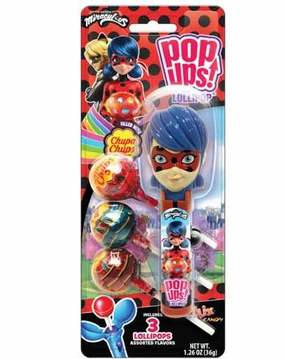 Spots on! Marinette has transformed but not into Ladybug... into a Pop Up! Each one contains one Pop Up and three Chupa Chups lollipops. Pop your lollipop into the Pop Up, push and lick, and then store away for later!