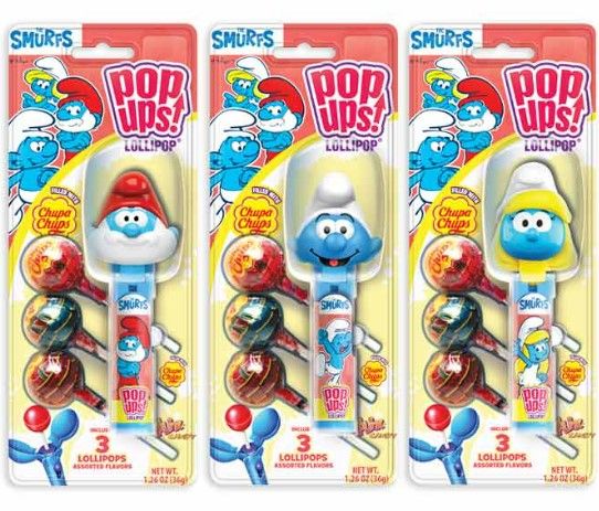 Smurf the whole day long! One of the Smurfs, Papa Smurf, and Smurfette are all available in cute Pop-Up format! Each one contains one Pop Up and three Chupa Chups lollipops. Pop your lollipop into the Pop Up, push and lick, and then store away for later!