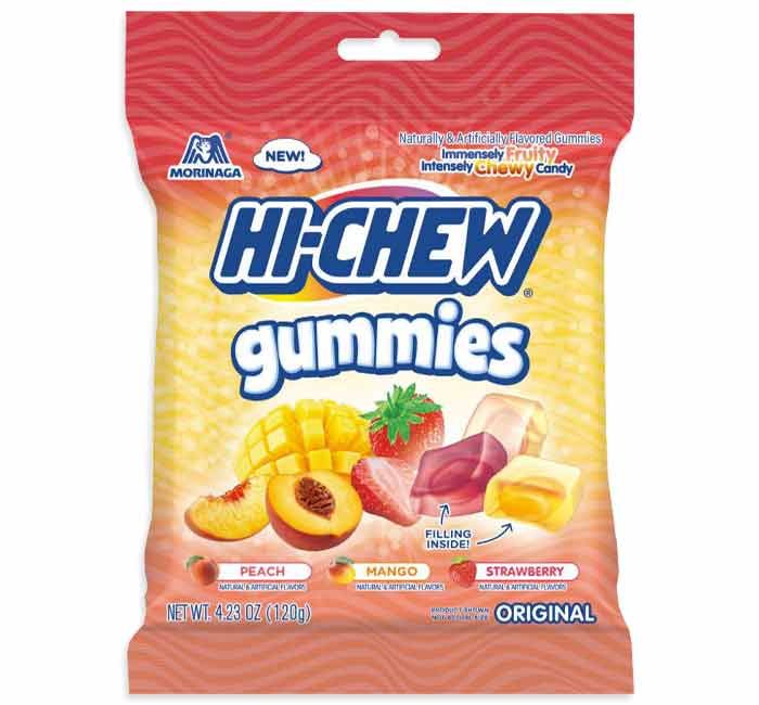 This new innovation from Hi-Chew has the same yummy Hi-Chew fruity flavors as the original chews, but in a gummy! These have the same double layer of flavor but now in a gummy form. Each piece has a filling for long lasting flavor. Enjoy these fruity gummies in peach, mango, and strawberry flavors. In a peg bag. best before 08.25
