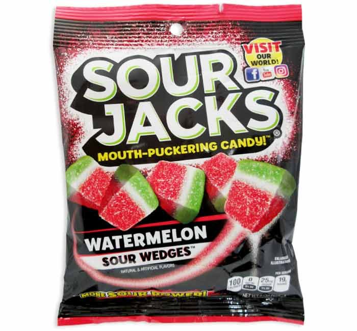 Sour Jacks Watermelon Sour Wedges are so sweet, so sour, and SO refreshing. Enjoy the taste of summer all year round! Sour Jacks unique wedge shape is unlike any other candy! Perfectly bite-sized, chewy, and covered in sour sanded goodness.