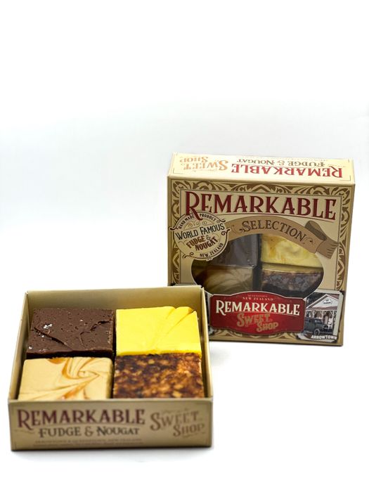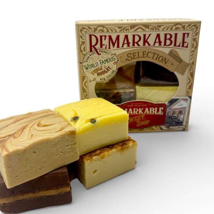 A selection of our 4 favourite fudge flavours in a gorgeous gift box. That's right! Our world famous fudge in four mouth-watering flavours - Creme Brulee (Our Best Seller), Dark Chocolate Caramel Sea Salt, Passionfruit and Caramel (Russian) - each 100 gram block individually wrapped. The gift box features classic images of the historic Queenstown region, home of the Remarkable Sweetshop, developed in cooperation with the Lakes District Museum. Buy 5 and get the 6th Fudge Box for Free, automatically!