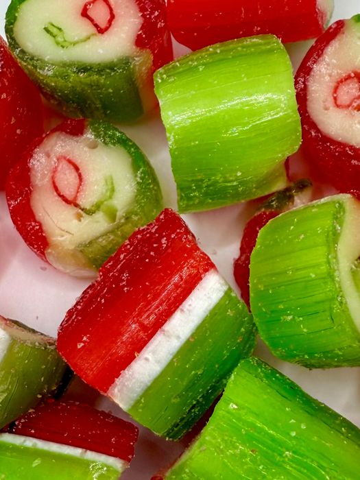 Hard boiled apple flavoured rock candies.