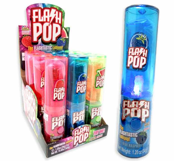 The long-time loved Flash Pop is easily a favorite among the kids! It includes a tasty cylindrical lollipop that lights up with the push of a button! Great for any sweet occasion and comes in 3 great flavors and colors.