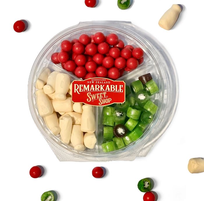 Classic Kiwiana and Kiwifruit! Jaffas, Milk Bottles and Kiwifruit Rock in a tray big enough to share. SELECTION MAY VARY