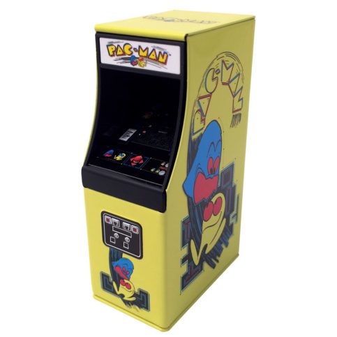 Each tin is shaped like the retro arcade cabinet and holds strawberry flavored Pac-Man Shaped candies.