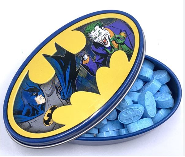 This DC Comic tin shows classic Batman with his Nemesis and inside are enjoyable sour blue raspberry candies.